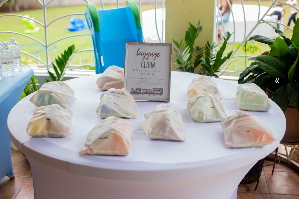 I customised these drawstring bags for the favours and packed them with a colouring pack, a vinyl labelled toddler cup and age appropriate snacks.