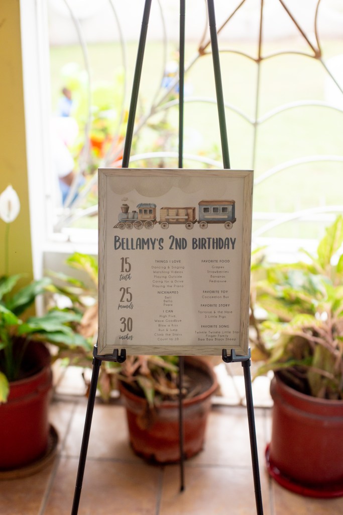 The entrance to the veranda I had this sign that said “Welcome to the Train Station.” I had a milestone plaque on display that had the same design elements as the invitation. I also made a few signs for the food and party favours tables.