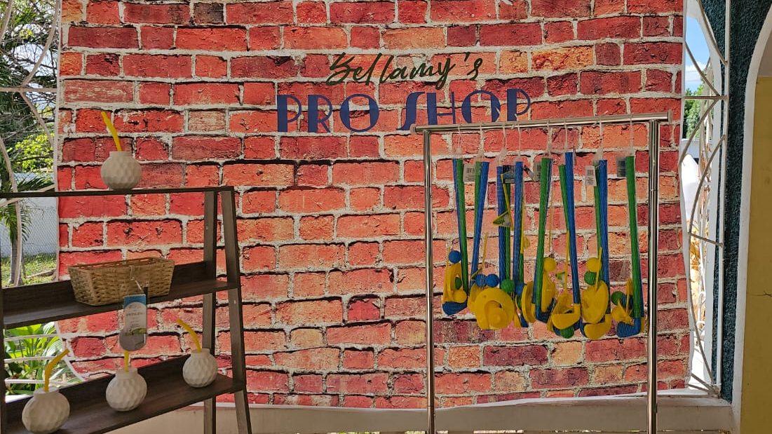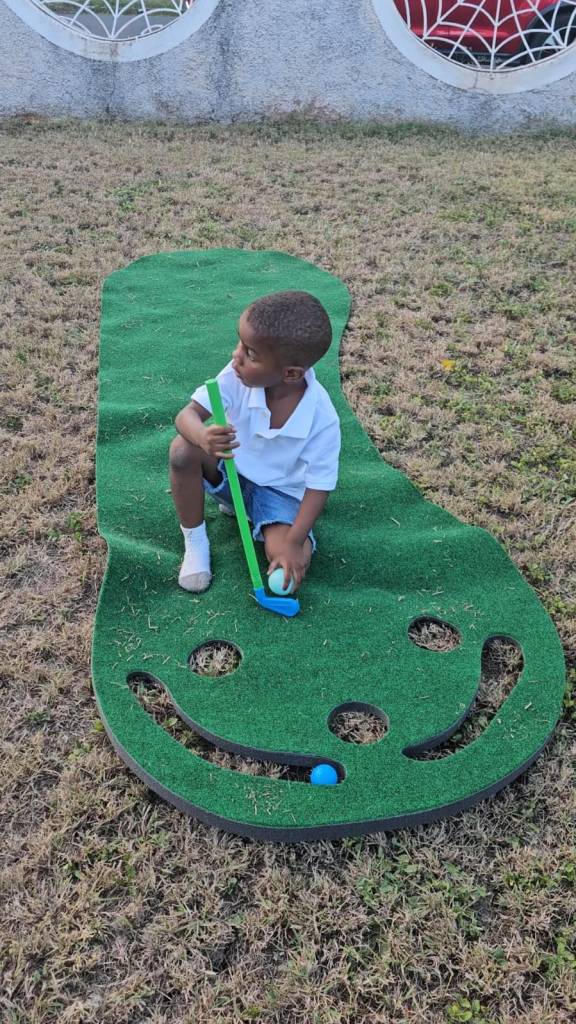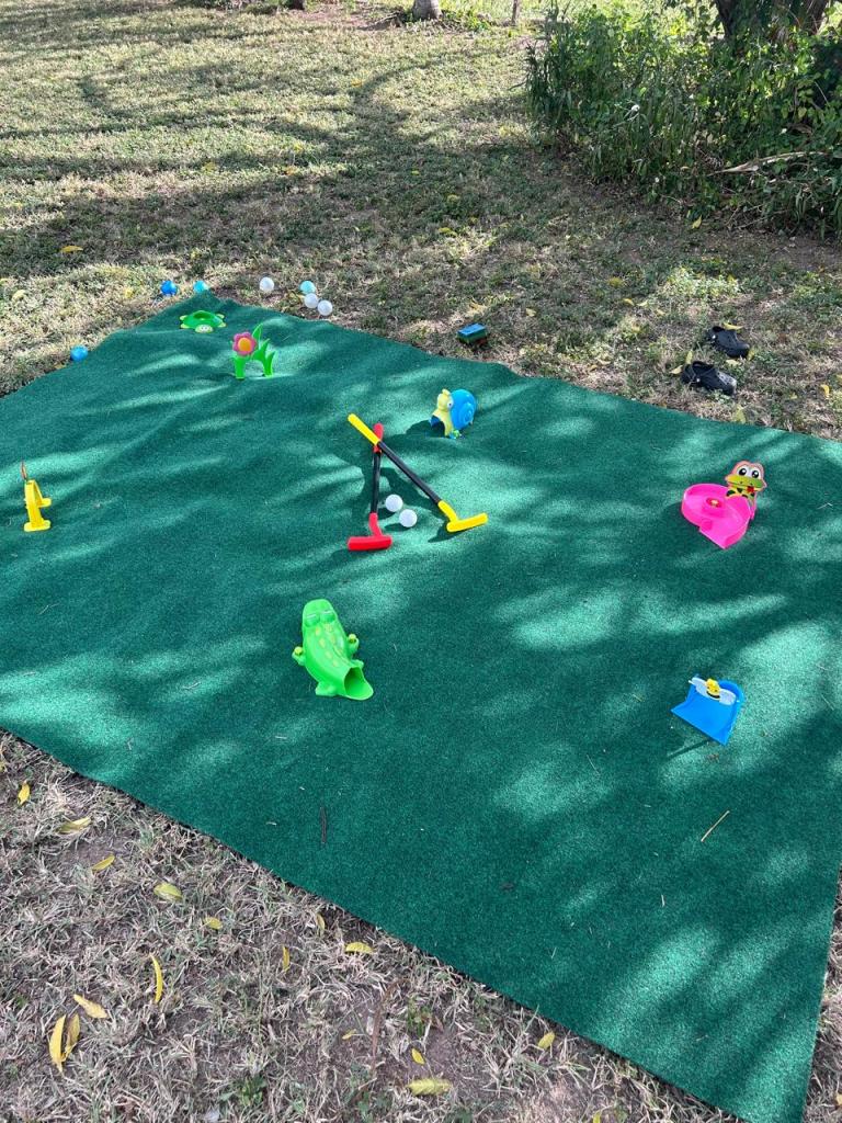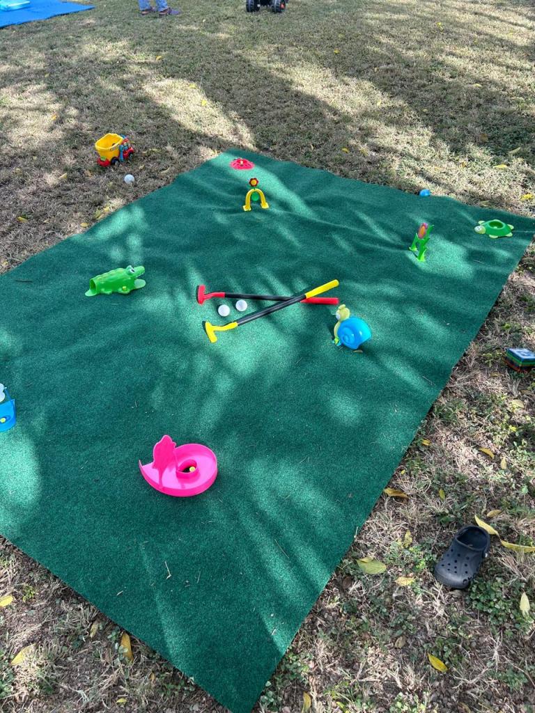 For the kids activities I set up the entire yard into various play areas. I had a small white bounce house with an attached ball pit. I also lay out some foam mats with some soft play shapes. In terms of a golf theme activities I bought this grass turf mat and this kids golf obstacle course set that comes with included club, driver and balls; ready for play.