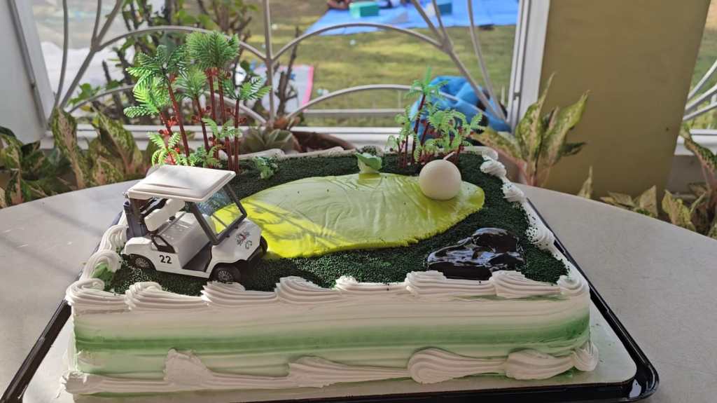 The golf ball sitting on top is actually a candle. You can find everything I used to decorate the cake here: Golf Scenery Cake.